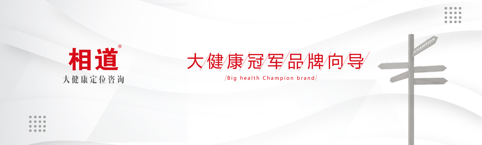 - 相道咨詢踐行以人為本,推動(dòng)大健康品牌化運(yùn)作,相時(shí)而動(dòng),道出奇正,做大健康冠軍品牌向?qū)?,攜手50名智慧合伙人,服務(wù)50家大健康領(lǐng)域冠軍品牌,力爭(zhēng)成為大健康領(lǐng)域品牌定位咨詢第一品牌